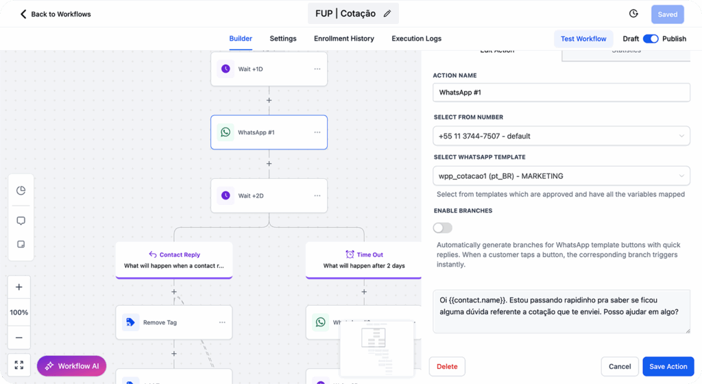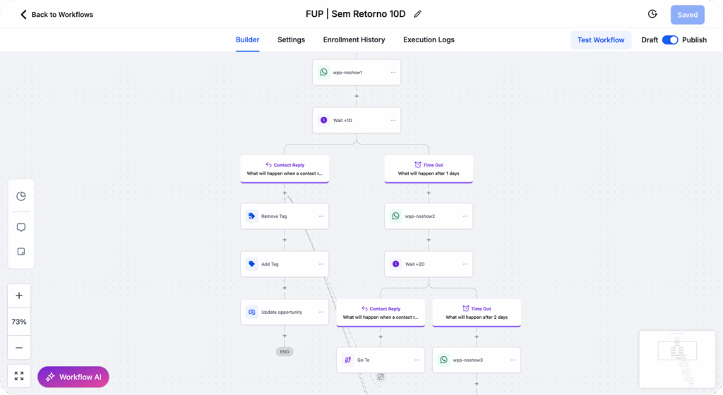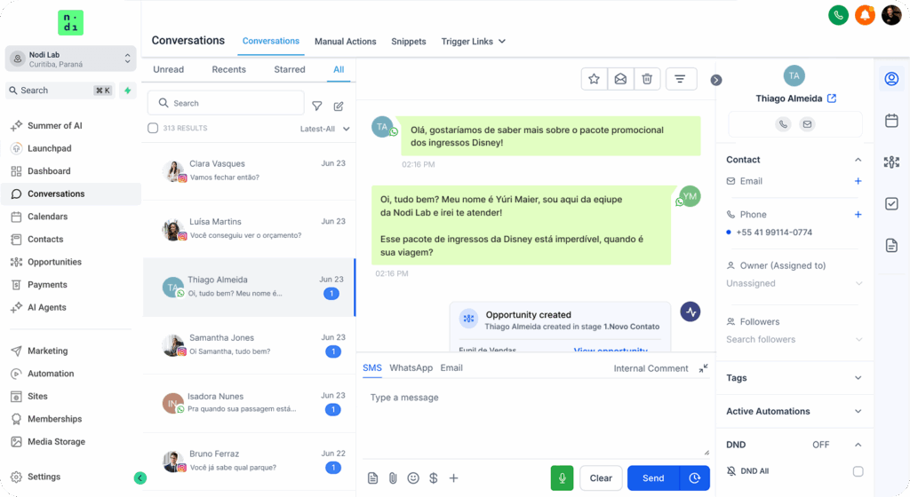 Mensagens automáticas, reativações e follow-ups rodam sozinhos. Você só entra na conversa quando realmente faz sentido.